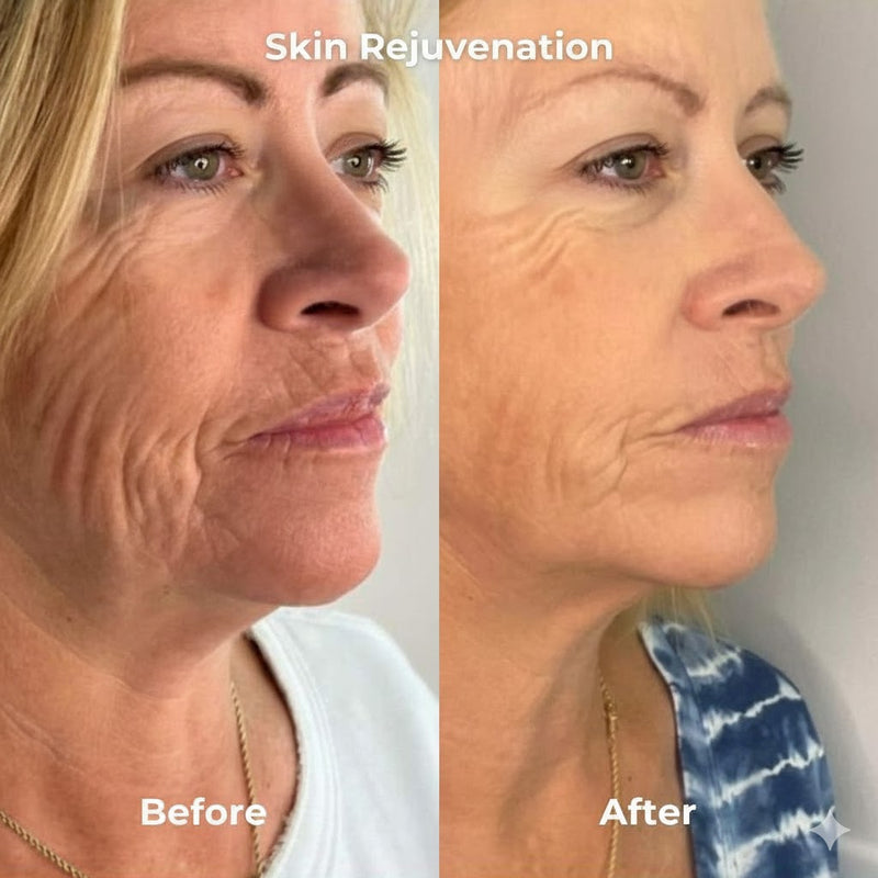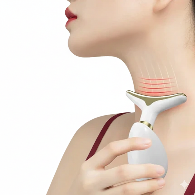 The product is a handheld, Y-shaped beauty device designed for skin rejuvenation, lifting, and firming of the face and neck. It comes in black and white with gold accents and is suggested to work by delivering multiple frequency levels to stimulate deeper skin and muscle layers. The device aims to address loose skin and lines, improving firmness, elasticity, and moisturizing effects.